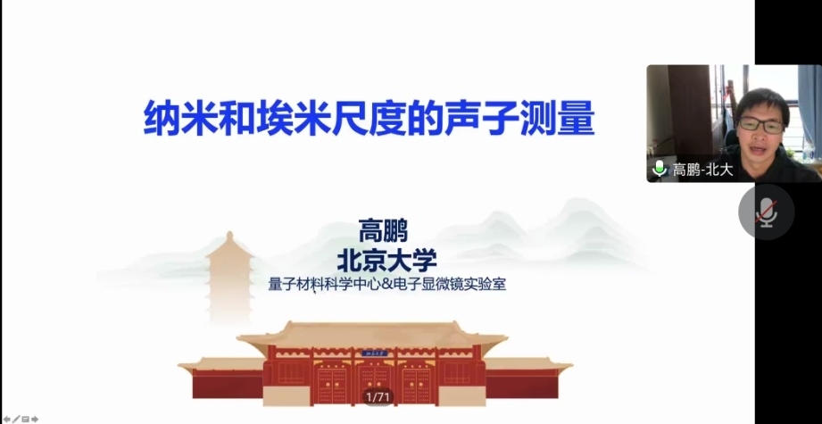 在报告之初,高鹏教授简单介绍了什么是声子,举例说明了声子技术广泛应用于生产生活、信息科技、能源科技等之中。而后,高鹏教授提出了用于解决测量单个纳米材料和表界面的声子色散问题的四维电子能量损失谱技术(4D-EELS),并介绍了透镜电子显微镜的工作原理。接着,高鹏教授讲解了其团队应用4D-EELS技术进行的工作,例如探测单层BN中声子极化激元、探测不同纳米线的能量分布与声子极化激元计算等。最后,高鹏教授总结了4D-EELS的优点与适用体系等,并对该技术的未来发展进行了展望。