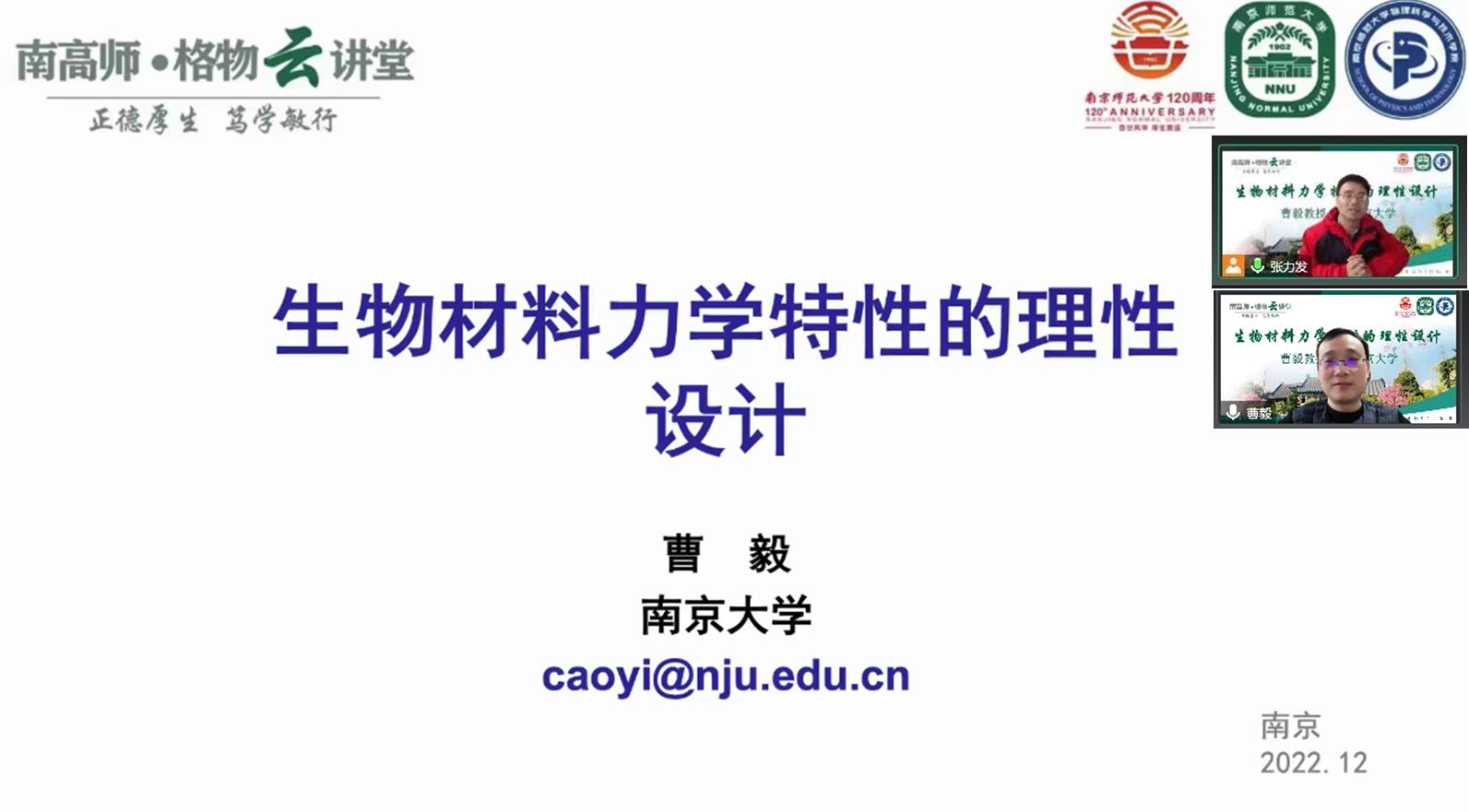 启动品牌系列讲座“南高师·格物云讲堂”,邀请国内外中青年杰出物理学者主讲。2022年12月7日,南京大学物理学院曹毅教授在腾讯会议、蔻享直播会议室开讲,作了题为“生物材料力学特性的理性设计”的学术报告。本次报告由物科院院长张力发教授主持,物科院教师、本科生、研究生及蔻享在线观众,共计1000余人参加了本次报告会。
