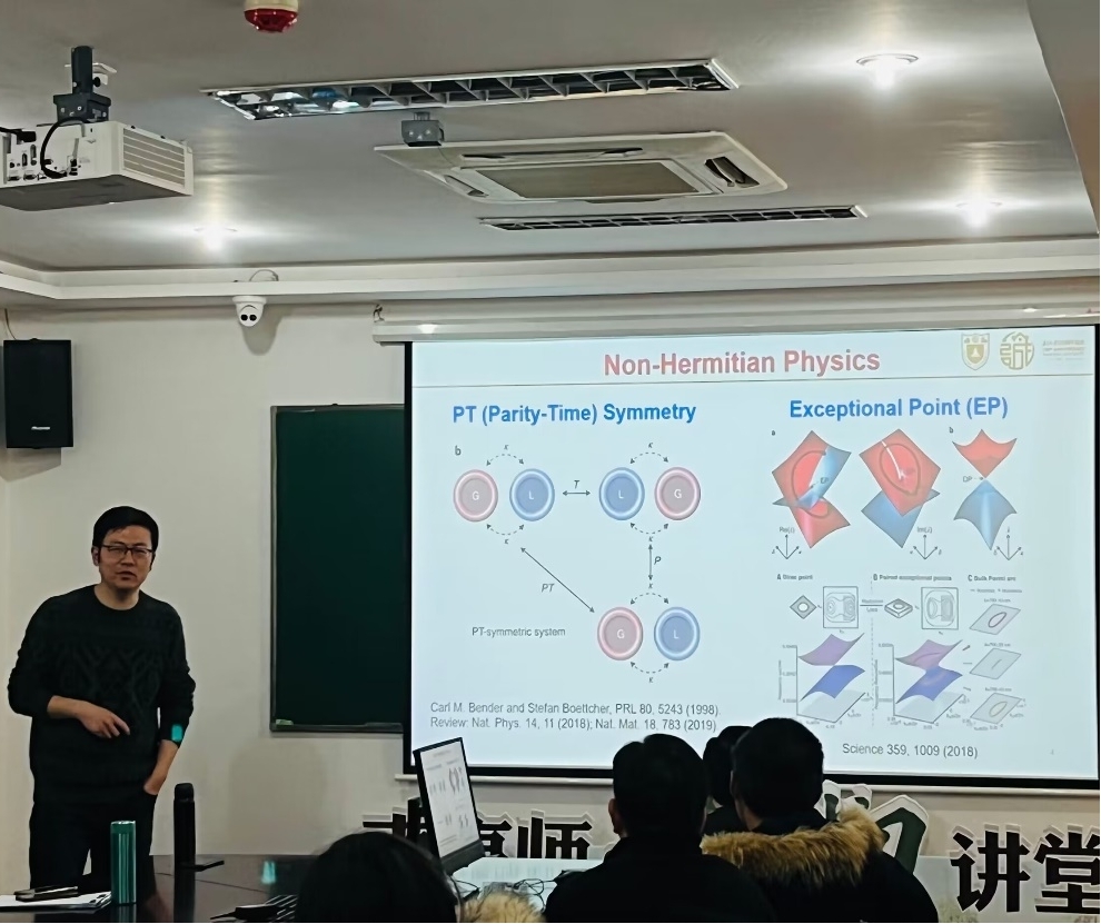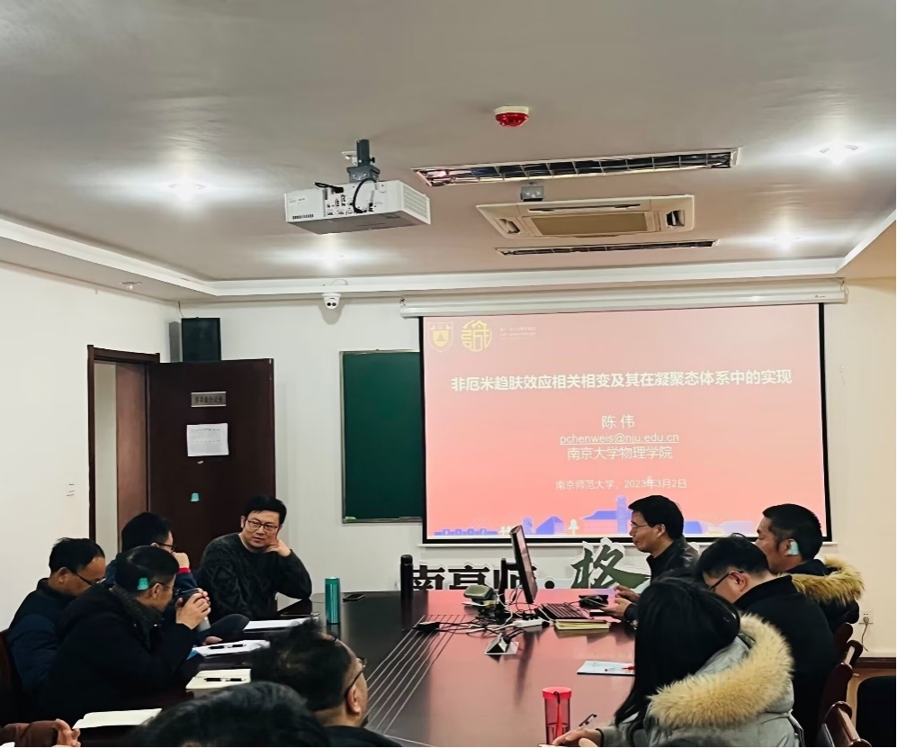 启动品牌系列讲座“南高师·格物讲堂”,邀请国内外中青年杰出物理学家主讲。2023年3月2日星期四下午,南京大学陈伟教授作了题为“非厄米趋肤效应相关相变及其在凝聚态体系中的实现”的学术报告。物科院教师、本科生、研究生共计40余人参加了本次报告。
