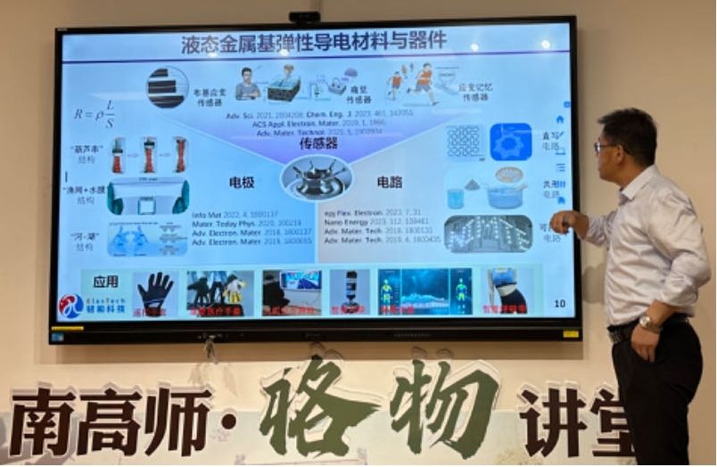 物联网技术、可穿戴和可植入技术的快速发展对电子器件提出了柔性化的迫切需求。柔性电子系统主要包括柔性电路、柔性传感器、柔性存储器等,用于运动、生理体征等信号的感知、传输与存储。电子元器件的基本单元包括电阻、电容、电感、晶体管等,而导电材料、介电材料、功能材料(半导体、磁性、铁电材料等)作为构成器件单元的基础材料,其柔性化方法受到广泛关注。在本次报告中,李老师主要介绍了团队在柔/弹性导电、铁电、磁性材料与传感器方面的研究工作。首先,在弹性导电材料与器件方面,介绍了基于室温液态金属材料,获得了兼具高电导率和大应变下稳定的弹性导电材料,开发了弹性加热器、弹性应变传感器、仿生痛觉感受器等原型器件,研发了实用化的弹性导线和弹性应变传感器。其次,在弹性铁电材料方面,介绍了该团队提出的利用化学交联方法使有机塑性PVDF基共聚物具有本征弹性的思路,通过精细调节交联反应,首次合成出具有本征弹性的铁电材料。最后,在柔性磁性功能材料和器件方面,介绍了该团队发现的应力对柔性磁性薄膜磁各向异性的定量调控规律,掌握了柔性磁性薄膜在应力作用下保持磁各向异性稳定的基本方法,制备了抗拉伸干扰的超弹性自旋阀磁传感器、三维力传感器、数字化仿生触觉传感器等。李老师团队的研究结果为实现柔性磁电功能器件在人机交互、健康监测等领域的应用奠定了良好的基础。在报告结束后,老师及同学们针对柔性磁电子器件的应用前景等问题进行了提问,李老师耐心地一一进行解答。同学们通过此次报告对可穿戴柔性磁电子器件有了深入的了解。