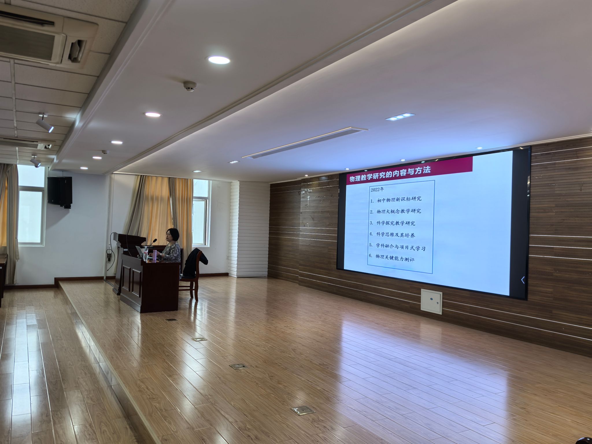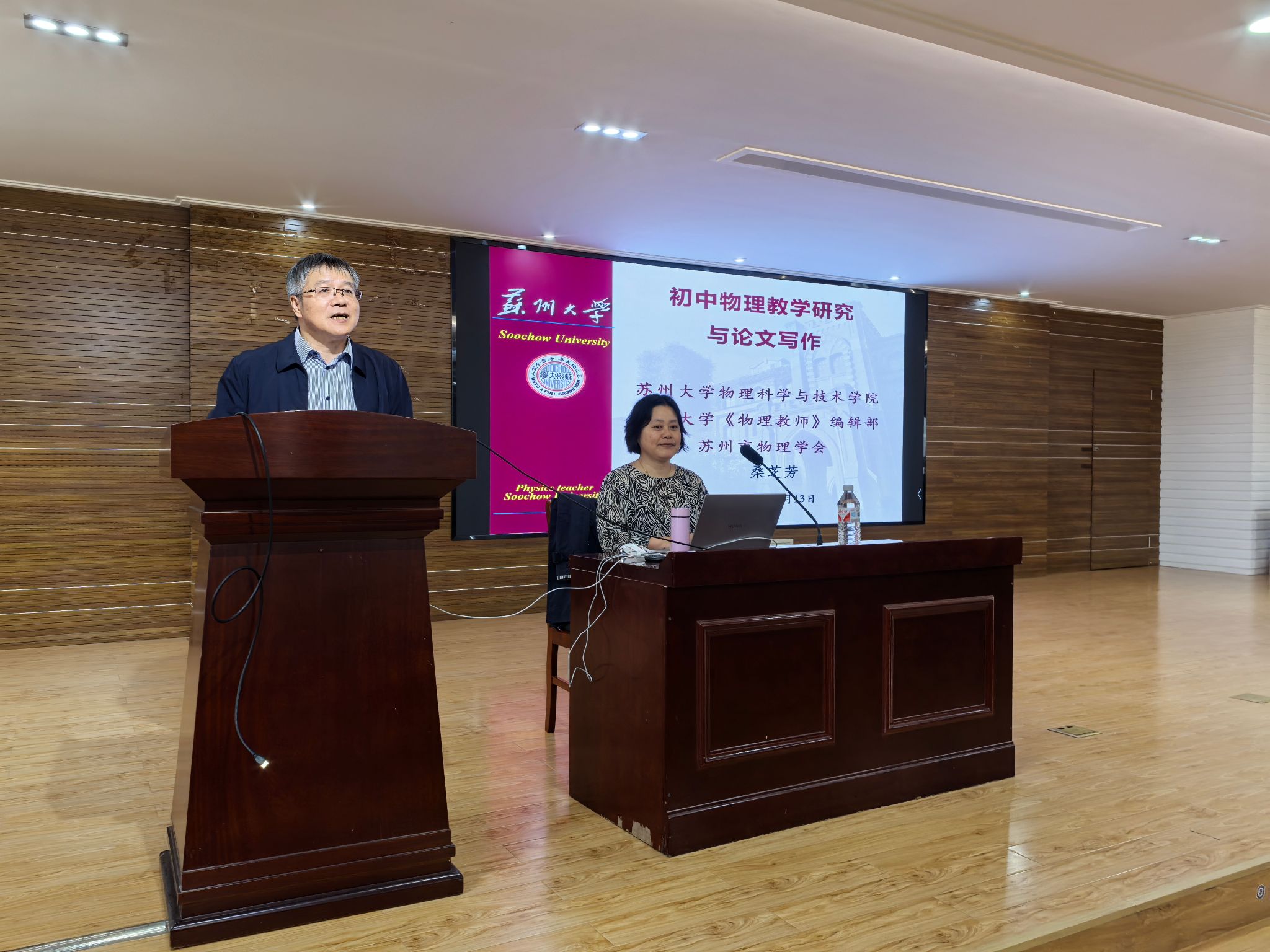 在行健楼435报告厅举办了题为“初中物理教学研究与论文写作”的【南高师·格物名师讲堂】活动。本次报告由苏州大学物理教育研究所所长、《物理教师》编辑部主任、常务副主编桑芝芳教授作为主讲嘉宾,物理教育研究所所长陆建隆教授主持,初中物理卓越教师创新培育计划的全体学员和物科院23、24级“物理+技术”双学科硕士层次师资培养实验班的部分学生共百余人参加。桑芝芳教授凭借其渊博的学术底蕴与丰富的实践经验,为听众们呈现了一场精彩绝伦的学术盛宴。